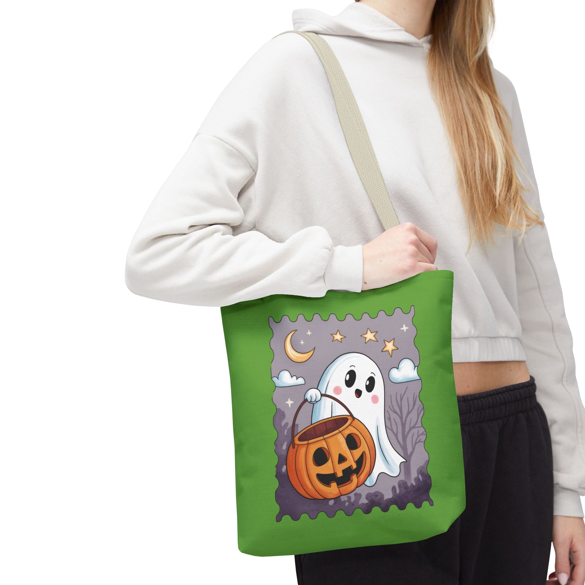 A spooky and fun Ghost stamp Halloween tote bag perfect for trick-or-treating or everyday use. Made with durable polyester fabric, reinforced stitching, and boxed corners for added room. Available in 5 handle colors and 3 sizes to match different needs.