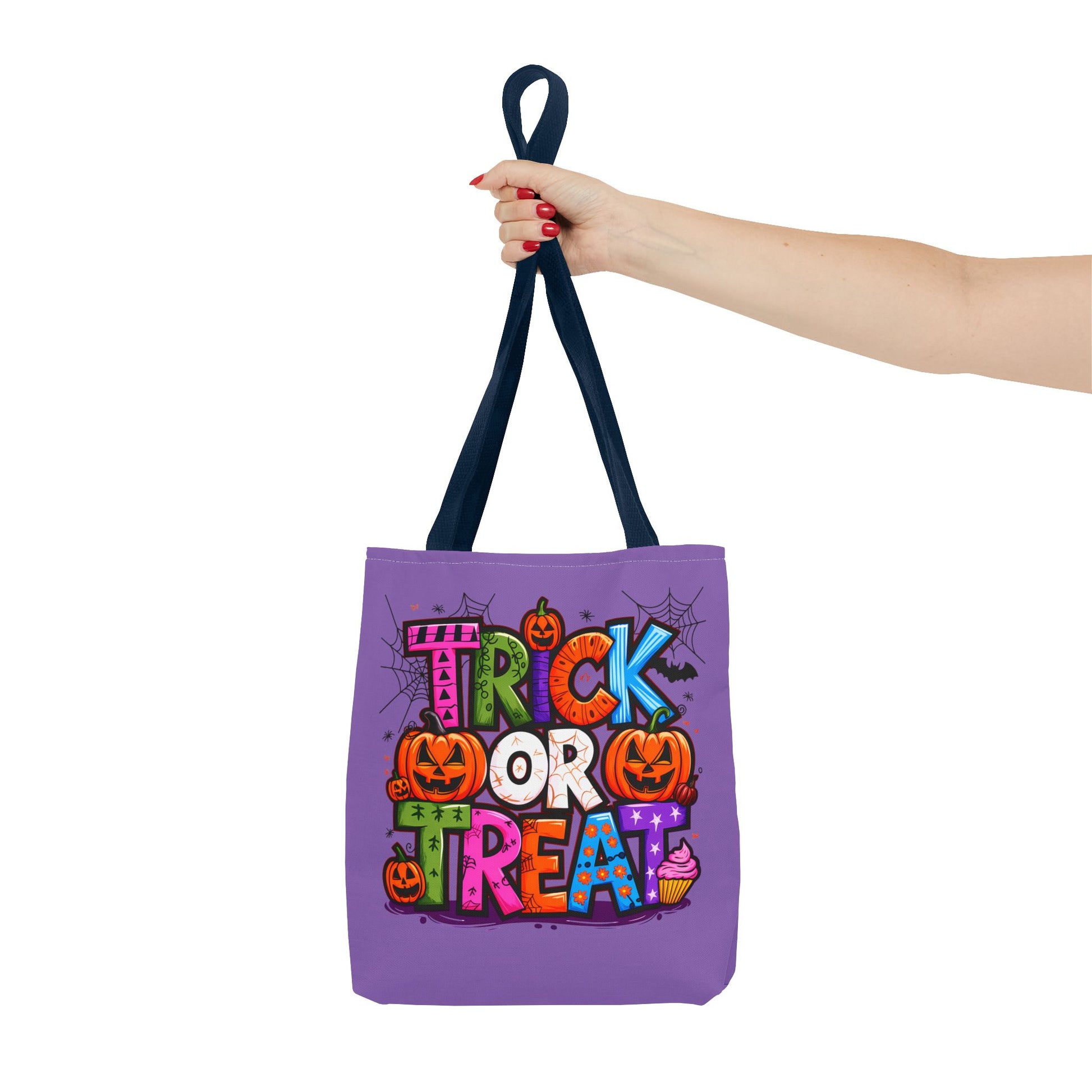 This Trick or Treat tote bag is the perfect accessory for Halloween lovers. Made with 100% polyester, this durable bag features reinforced stitching on handles and boxed corners for added strength. With 5 color handle options and 3 size choices, this tote bag is versatile and practical for everyday use. Ideal for Halloween trick or treating or as a festive gift for friends and family.